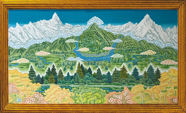2020年,60歲的昂桑拜師一級美術(shù)師敬庭堯?qū)W習(xí)國畫,次年創(chuàng)作《雅魯藏布大峽谷》,雄渾地貌與水墨意境渾然天成。