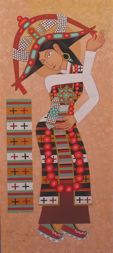 在昂?!皞鹘y(tǒng)當(dāng)隨時代”的藝術(shù)理念浸潤下,徒弟們總能在傳統(tǒng)與當(dāng)代的碰撞中找到獨特的表達坐標(biāo):來自日喀則的藝術(shù)家多吉次旺,早年被昂桑畫作中藏文元素與抽象色塊的融合所震撼。如今在拉薩創(chuàng)辦工作室的他,正將藏文書法的中鋒筆觸解構(gòu)為流動的視覺符號——烏金體的頓挫韻律幻化為色彩的潮涌,在畫布上重現(xiàn)古老史詩的“當(dāng)代心跳”;而主演《文成公主》實景劇的馮佳,這位四川傳媒大學(xué)表演系的畢業(yè)生,跟隨昂桑學(xué)畫四年,已能在《文成公主》系列中將唐卡礦物顏料的莊重與波普藝術(shù)的色塊切割并置,讓歷史人物既保有壁畫般的莊重感,又流淌著屬于時代的視覺節(jié)奏。