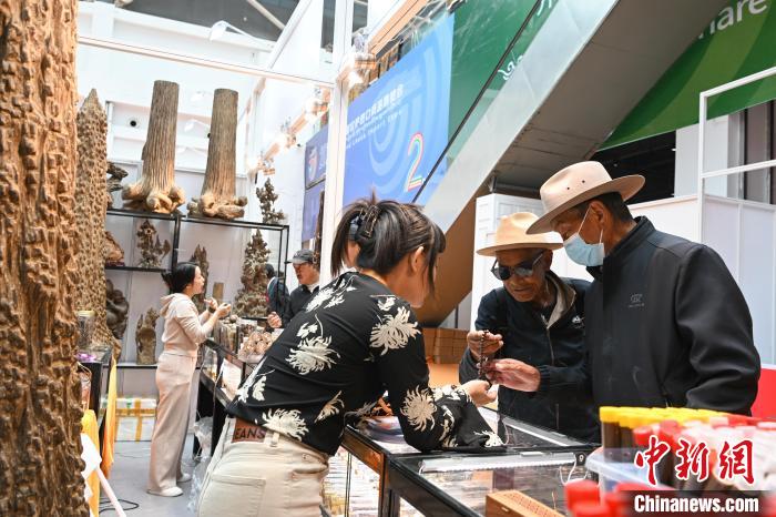 圖為拉薩進口商品展覽會現(xiàn)場,伊朗商人(右)向顧客品嘗藏紅花。中新社記者 貢嘎來松 攝