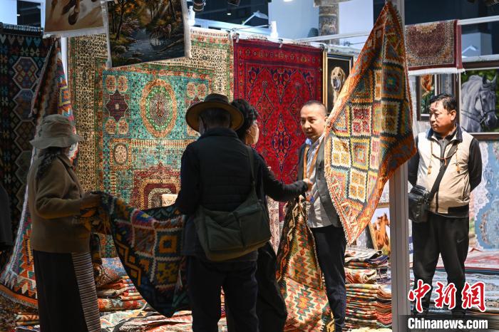 圖為拉薩進口商品展覽會現(xiàn)場,伊朗商人(左)向顧客介紹、推銷毛毯。中新社記者 貢嘎來松 攝