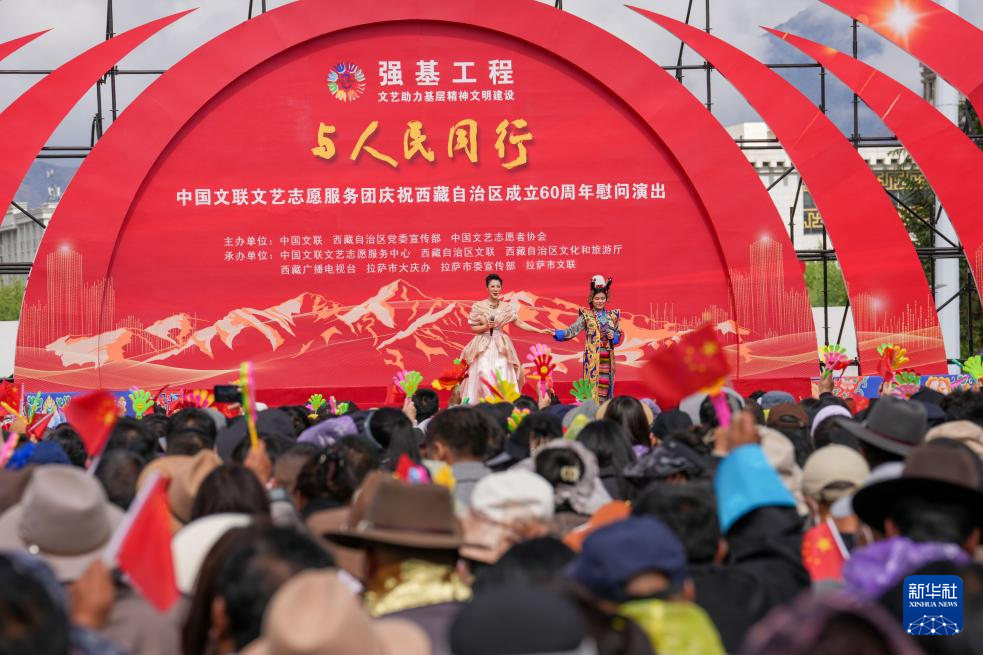 5月25日,由中國(guó)文聯(lián)、西藏自治區(qū)黨委宣傳部、中國(guó)文藝志愿者協(xié)會(huì)主辦的“與人民同行”中國(guó)文聯(lián)文藝志愿服務(wù)團(tuán)慶祝西藏自治區(qū)成立60周年慰問(wèn)演出在位于拉薩的西藏會(huì)展中心廣場(chǎng)舉行。