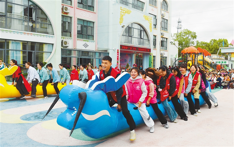嘎瑪貢桑社區(qū)干部和拉薩市實驗幼兒園東城分園的教師參加“劃龍舟”比賽。