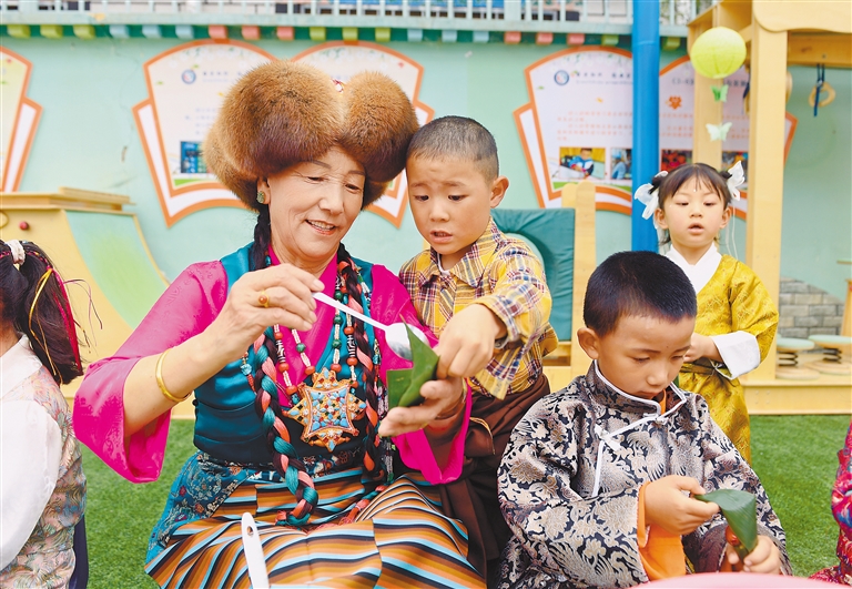 嘎瑪貢桑社區(qū)文藝隊隊員和拉薩市實驗幼兒園東城分園的孩子一起包粽子。