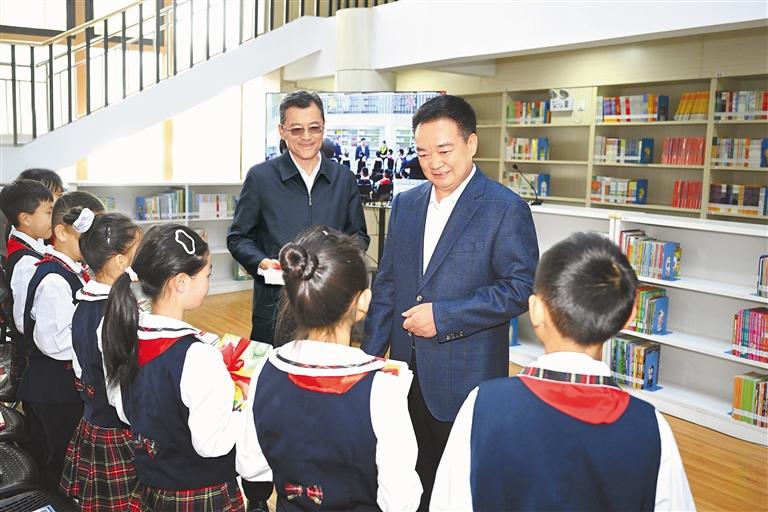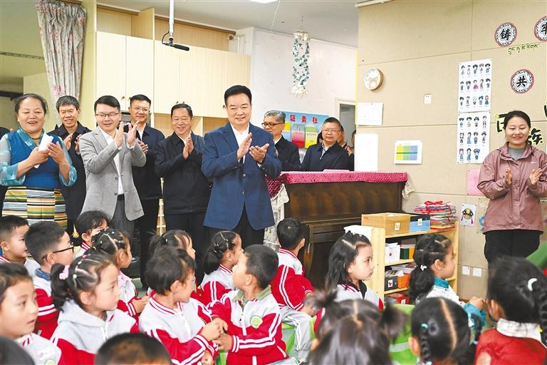 初夏,萬物并秀,生機(jī)勃發(fā),拉薩市實(shí)驗(yàn)小學(xué)書聲瑯瑯。王君正走進(jìn)校園,察看學(xué)校環(huán)境,參觀自然、閱讀、書法、體育等教育成果展示,了解學(xué)校歷史沿革、建設(shè)發(fā)展、教育教學(xué)等情況。他指出,習(xí)近平總書記高度重視、親切關(guān)懷少年兒童和少先隊(duì)工作,多次參加少先隊(duì)活動(dòng),發(fā)表重要講話、作出重要指示。5月27日,習(xí)近平總書記致信祝賀中國(guó)少年先鋒隊(duì)第九次全國(guó)代表大會(huì)召開,殷切寄語(yǔ)廣大少年兒童,飽含著對(duì)大家的深切關(guān)愛。要加強(qiáng)愛國(guó)主義教育,講好思政課,著力講好黨的故事、革命的故事、英雄的故事,時(shí)刻把祖國(guó)和人民放在心中,不忘初心、童心向黨,從小聽黨話、感黨恩、跟黨走;要積極推廣國(guó)家通用語(yǔ)言文字,把鑄牢中華民族共同體意識(shí)根植少年兒童心靈深處,引導(dǎo)他們爭(zhēng)做民族團(tuán)結(jié)的小石榴籽,爭(zhēng)當(dāng)學(xué)習(xí)和踐行社會(huì)主義核心價(jià)值觀的小模范。圖書館內(nèi),“紅領(lǐng)巾小書蟲”讀書分享活動(dòng)正在進(jìn)行,孩子們圍坐在一起,與定日縣長(zhǎng)所鄉(xiāng)完全小學(xué)學(xué)生視頻連線,共同分享喜歡的書籍,王君正認(rèn)真傾聽、親切詢問,向孩子們贈(zèng)送書籍?!白鎳?guó)的未來和希望在你們身上,要熱愛祖國(guó)、好好學(xué)習(xí)、天天向上,從小培養(yǎng)良好的道德情操?!蓖蹙膭?lì)他們說,要多讀書、讀好書,從書中汲取智慧和營(yíng)養(yǎng),將來做對(duì)國(guó)家、對(duì)人民、對(duì)社會(huì)有用的人。