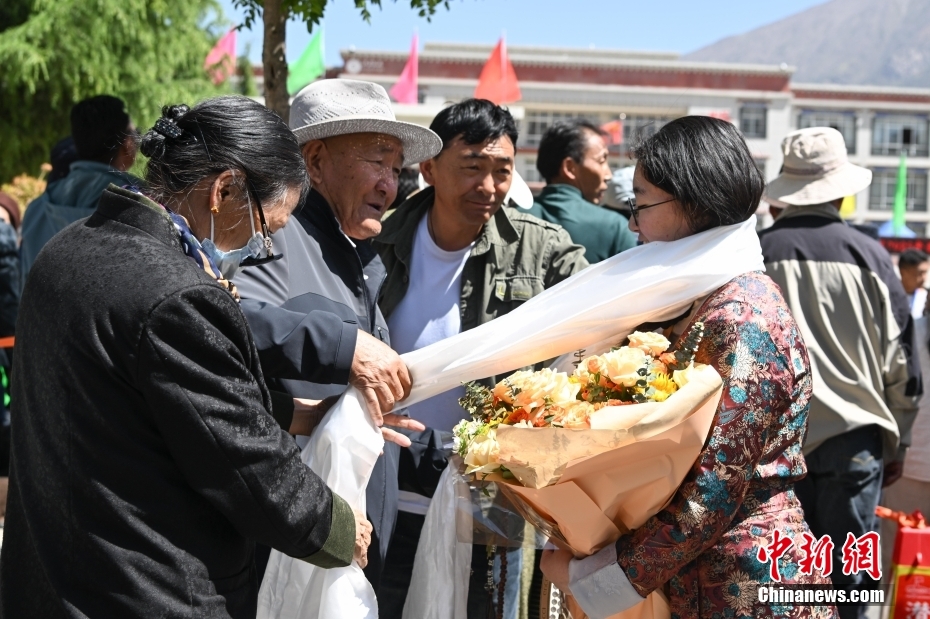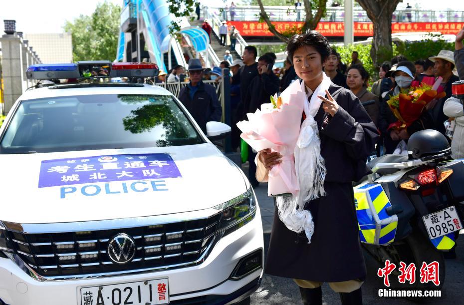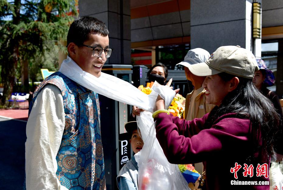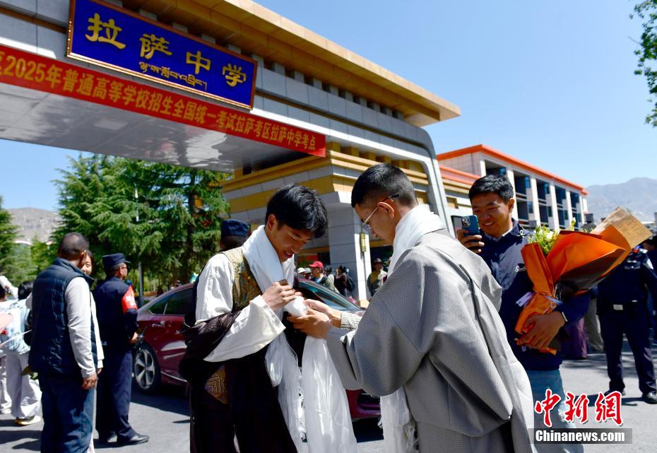 6月9日,西藏拉薩江蘇實驗中學考點外親友為考生送上哈達。當日,西藏自治區(qū)2025年普通高考完成所有科目考試,2025年西藏高考落下帷幕。中新社記者 貢嘎來松 攝