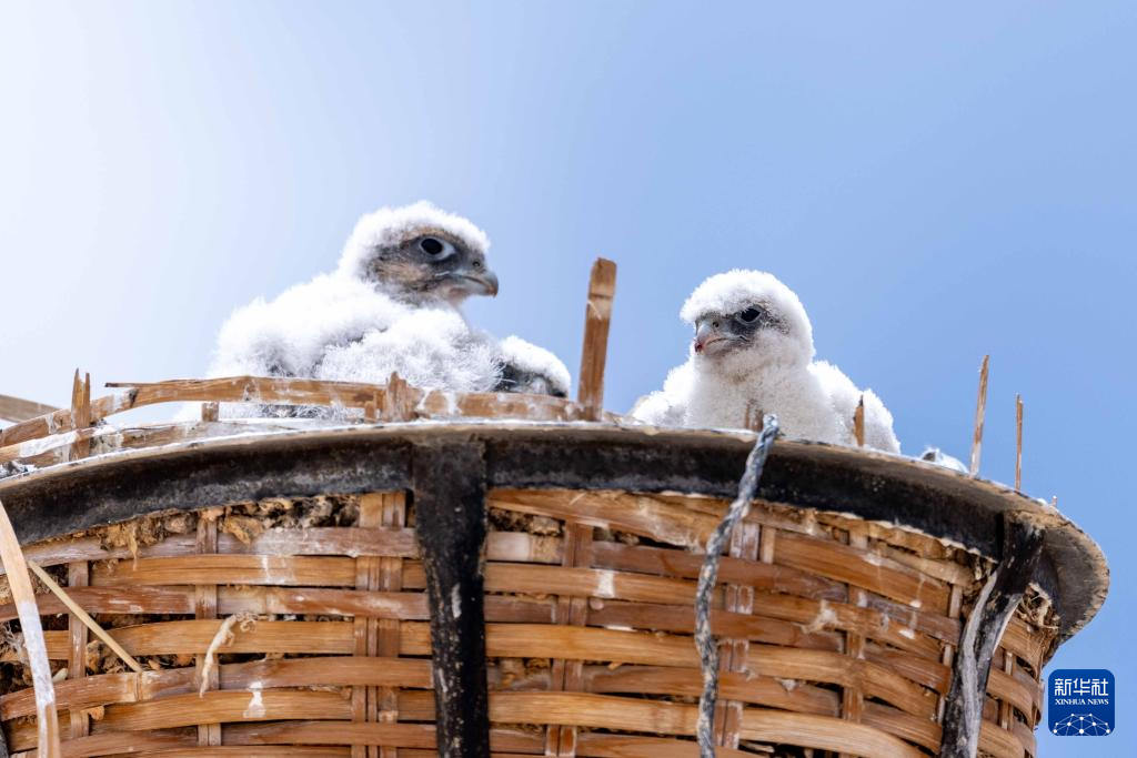 6月7日拍攝的在鷹架上巢中棲息的游隼雛鳥。新華社記者 旦增尼瑪曲珠 攝