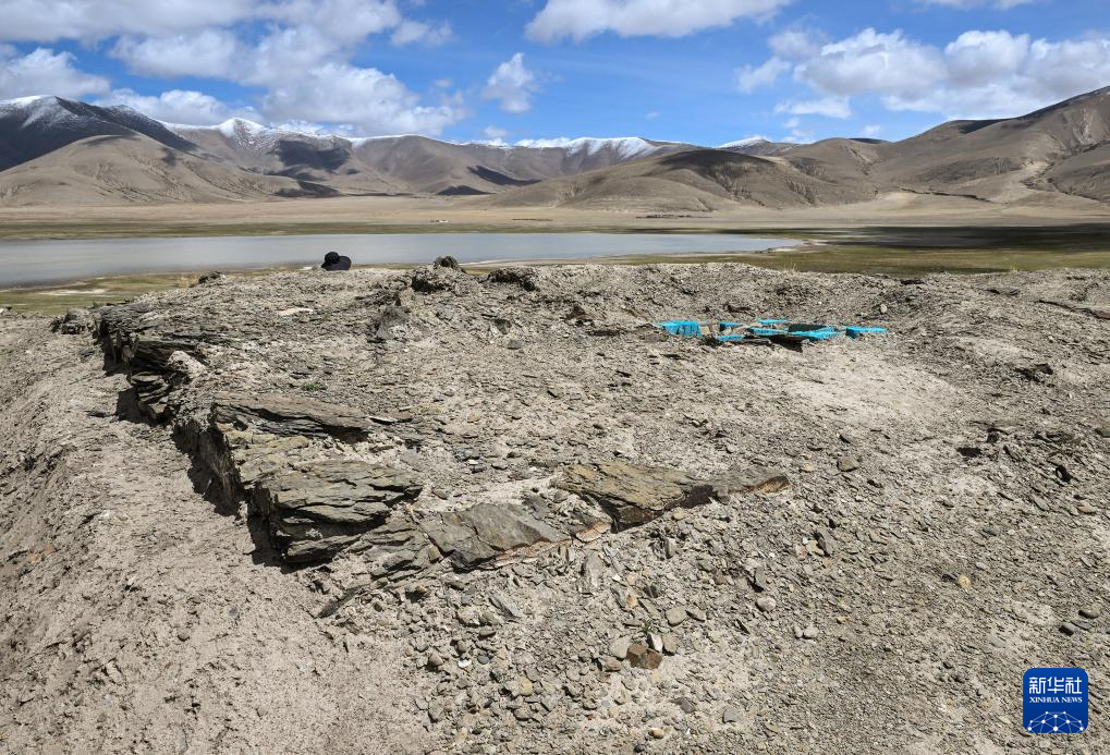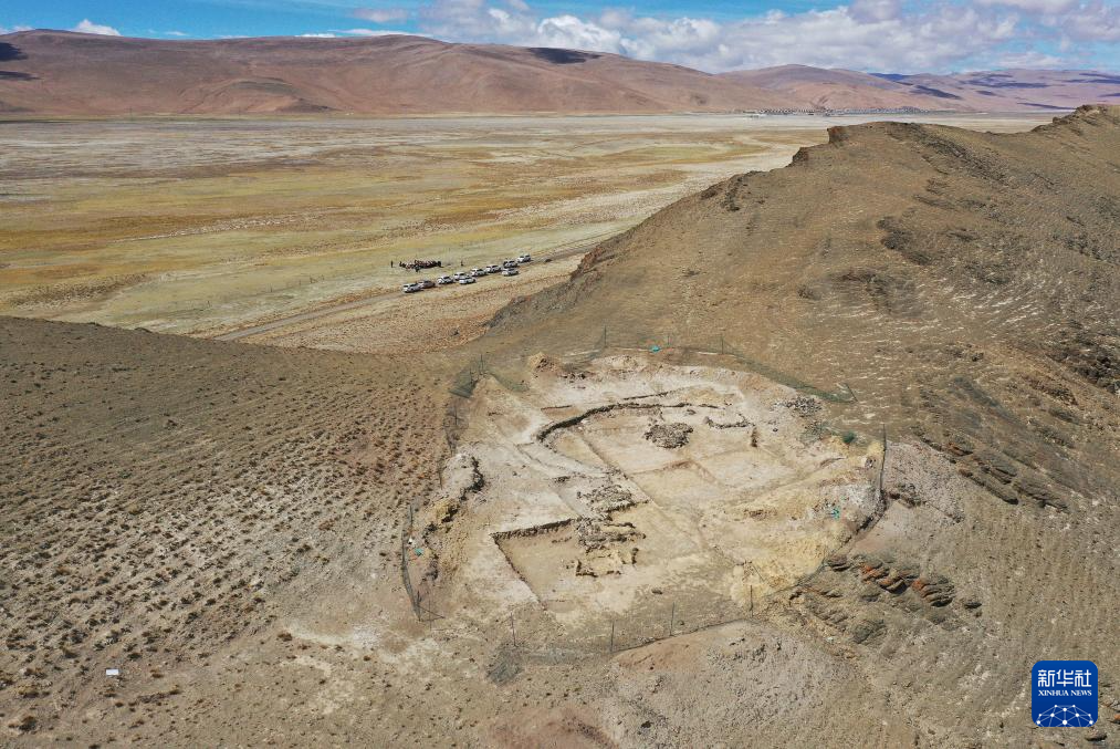 這是5月22日拍攝的坐落在瑪不錯湖畔的遺址第四期石構地面建筑考古發(fā)掘現(xiàn)場(無人機照片)。新華社記者 李賀 攝