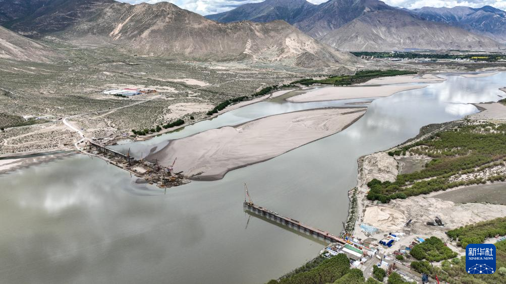 建設中的薩熱路跨江大橋(6月18日攝,無人機照片)。新華社記者 晉美多吉 攝