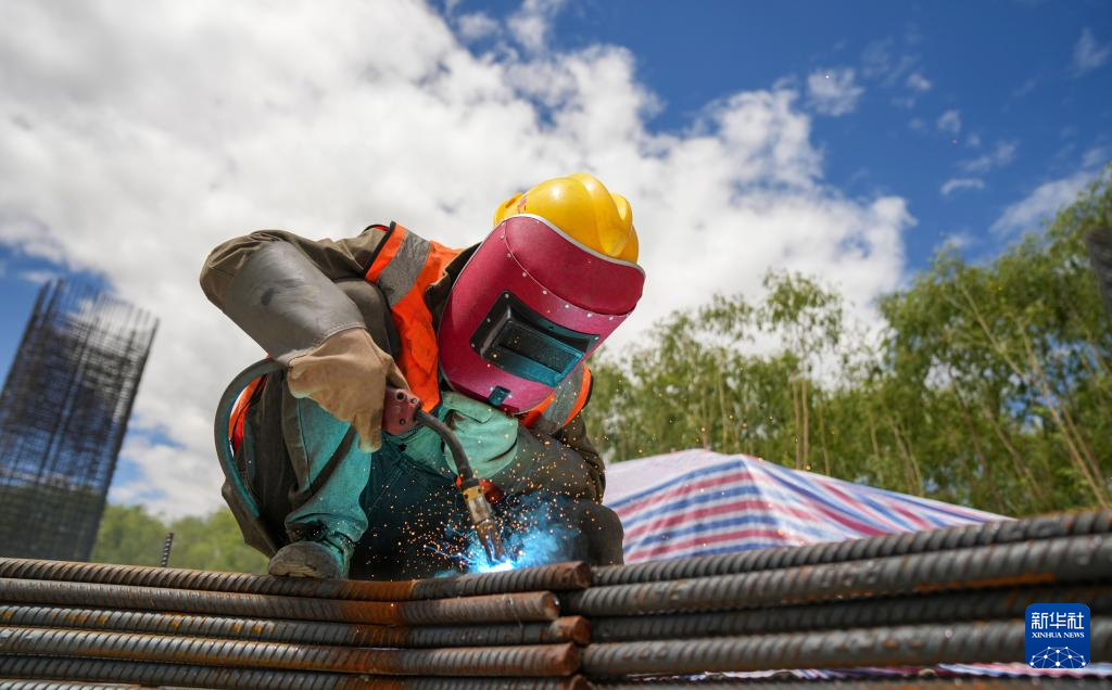 工人在薩熱路跨江大橋建設現(xiàn)場焊接鋼筋(6月18日攝)。新華社記者 晉美多吉 攝