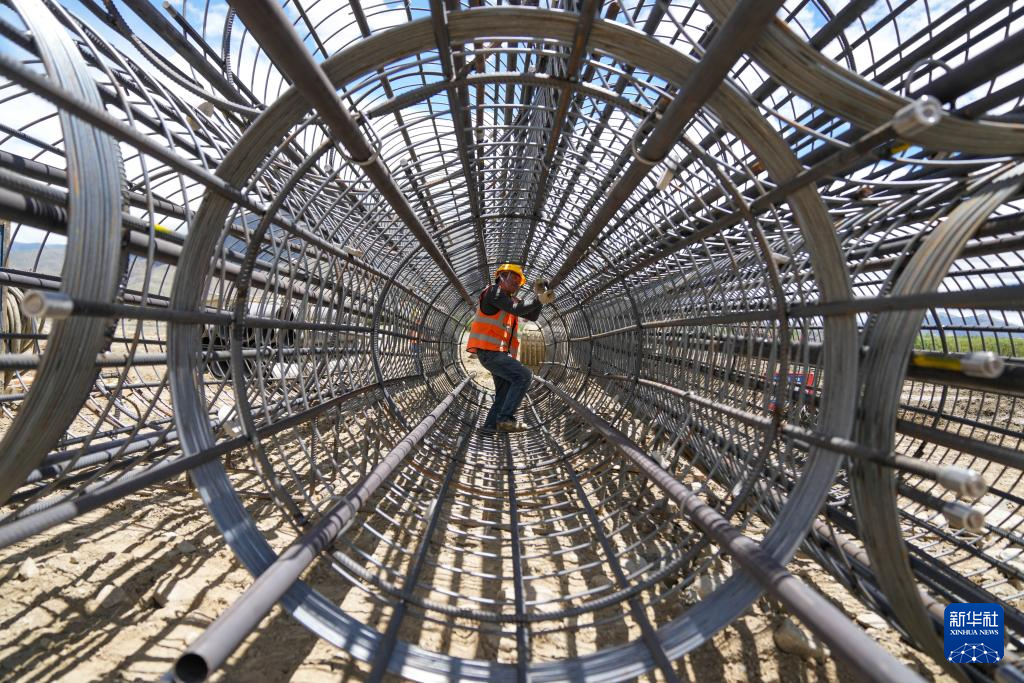 工人在薩熱路跨江大橋建設現(xiàn)場綁扎聲測管(6月18日攝)。新華社記者 晉美多吉 攝