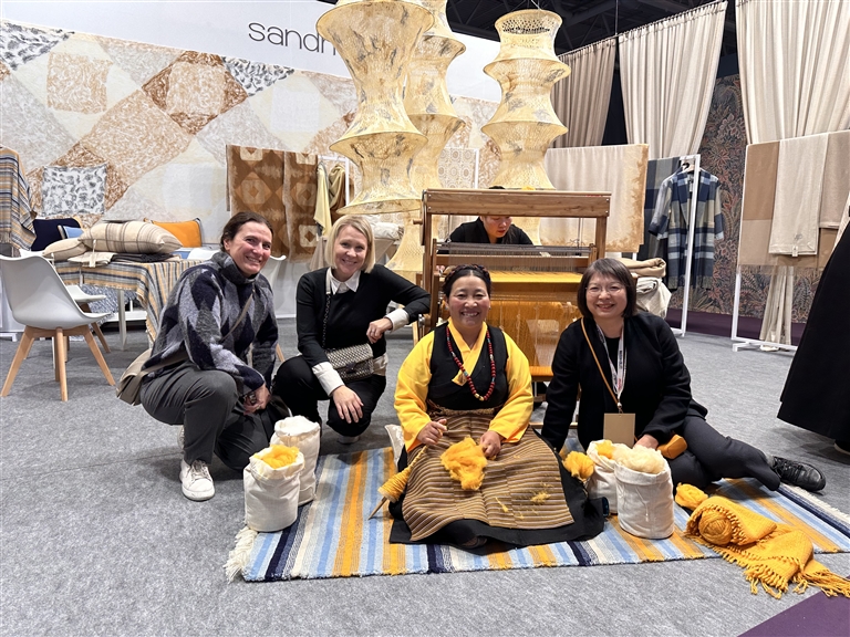 上海市援藏干部人才引進(jìn)的沙涓攜西藏江孜氆氌亮相2024年法國巴黎Maison&Objet展會。