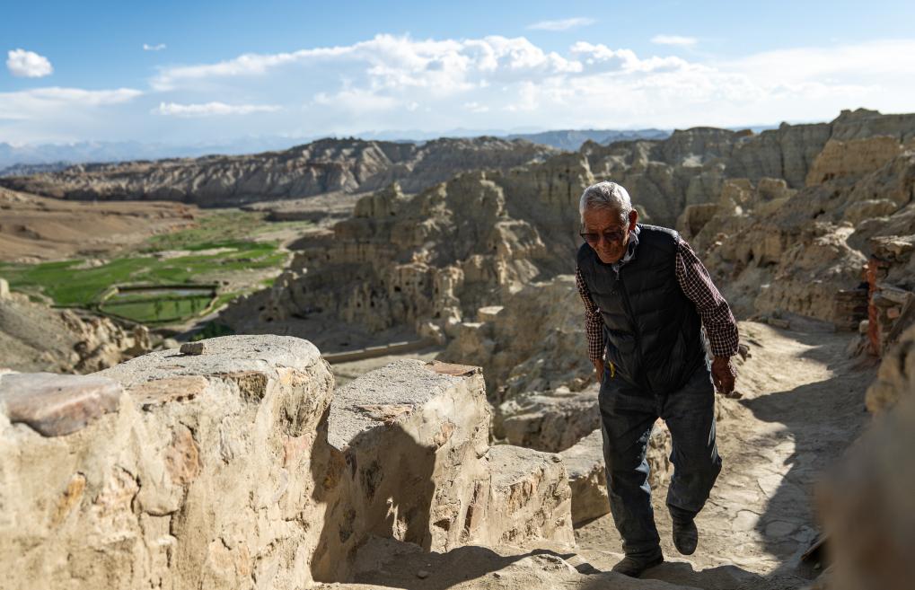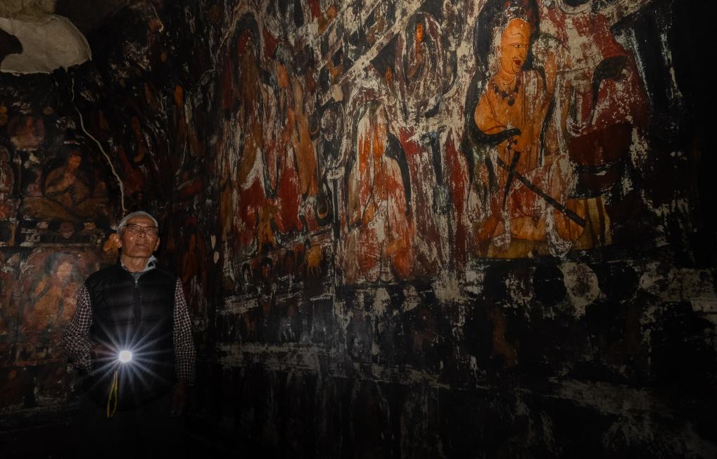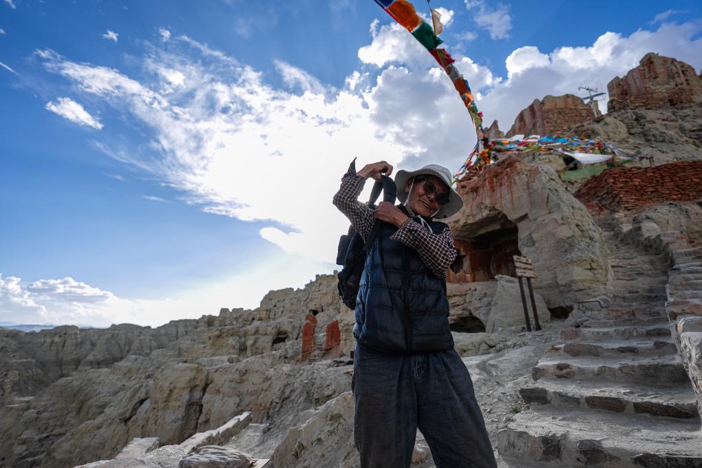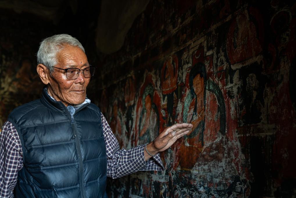 仁增旺扎巡查各個(gè)石窟,這是他多年來的習(xí)慣(2023年5月26日攝)。