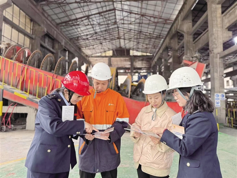 稅務(wù)工作人員在礦山企業(yè)生產(chǎn)經(jīng)營場所開展稅費(fèi)宣傳。圖由自治區(qū)稅務(wù)局提供