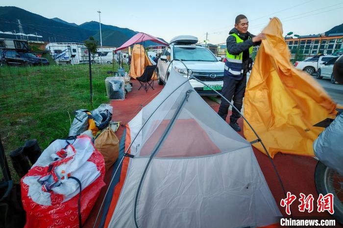 6月26日,摩旅理發(fā)師李秋實(shí)到達(dá)西藏林芝宇拓公園自駕露營(yíng)地,搭建帳篷準(zhǔn)備過(guò)夜。中新社記者 江飛波 攝