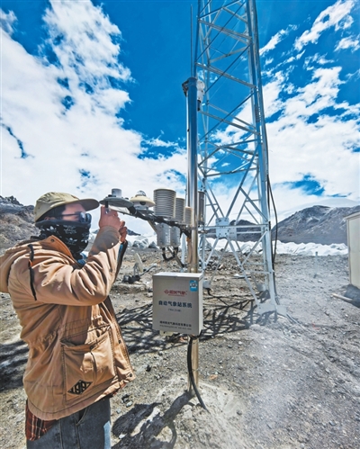 安多縣的氣象裝備保障人員在格拉丹東自動氣象站開展維護(hù)保障工作。安多縣氣象局供圖