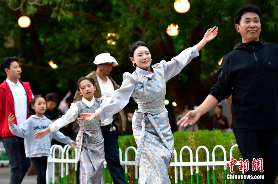 7月13日,西藏昌都瀾滄江天津廣場(chǎng)上,鍋莊舞愛(ài)好者踏歌起舞,舞出夏日夜間精彩。中新社記者 李林 攝