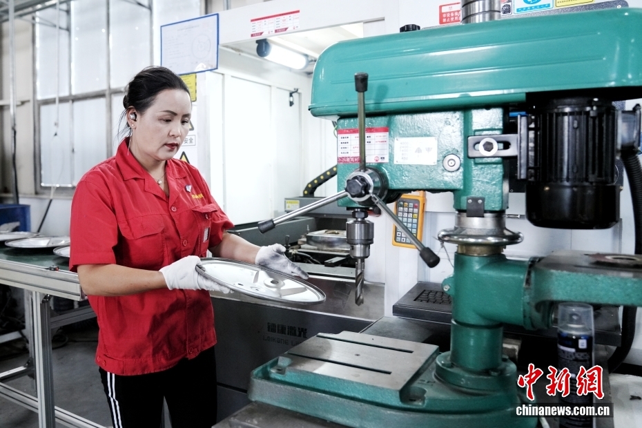 7月17日,在位于拉薩的西藏尚廚炊具科技有限公司,工人使用機(jī)械生產(chǎn)高壓鍋鍋蓋。受西藏海拔高氣壓低的影響,長期以來西藏民眾面臨飲用水沸點(diǎn)低、食物難以煮熟、普通高壓鍋不適用高原環(huán)境等問題的困擾。2022年,該公司作為首家高原地區(qū)多功能烹飪炊具生產(chǎn)企業(yè)落地拉薩,研發(fā)、生產(chǎn)、銷售高原多功能炊具產(chǎn)品,促進(jìn)西藏經(jīng)濟(jì)發(fā)展的同時(shí)也緩解了西藏民眾的飲食困擾。中新社記者 張祥毅 攝