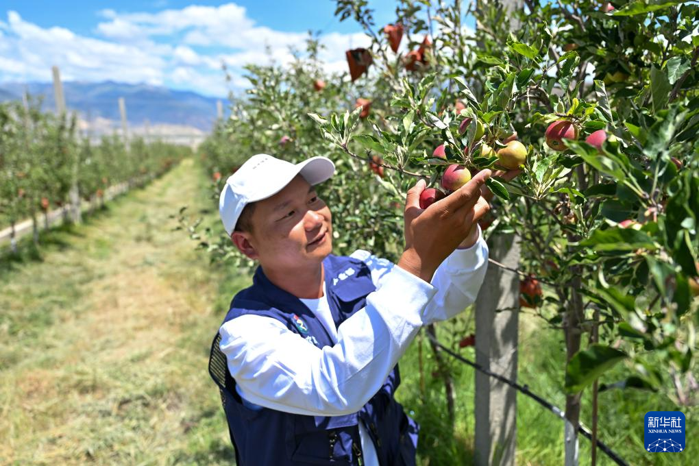 7月19日,西藏扎囊縣的矮化蘋果種植園區(qū)的工作人員查看蘋果長(zhǎng)勢(shì)。新華社記者 李鑫 攝
