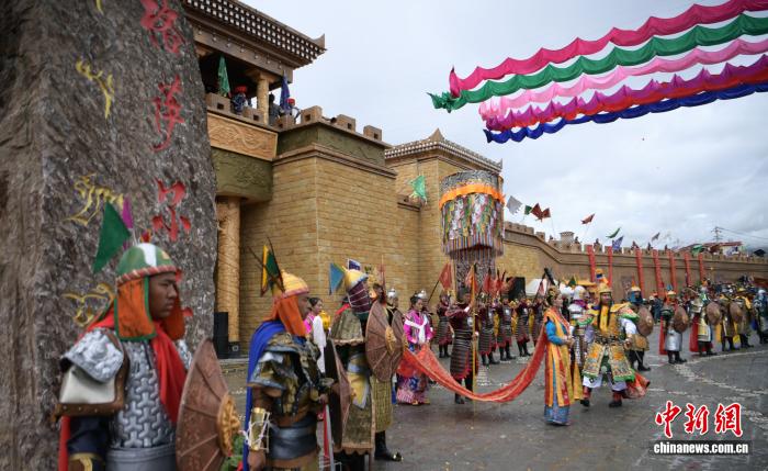 2019年9月16日,四川甘孜縣格薩爾王城暨百村產(chǎn)業(yè)基地舉行開(kāi)城儀式,城內(nèi)以格薩爾故事打造的景觀(guān)小品體驗(yàn)地有1000余處,游客可聽(tīng)《格薩爾》說(shuō)唱、看《格薩爾》藏戲等。中新社記者 劉忠俊 攝