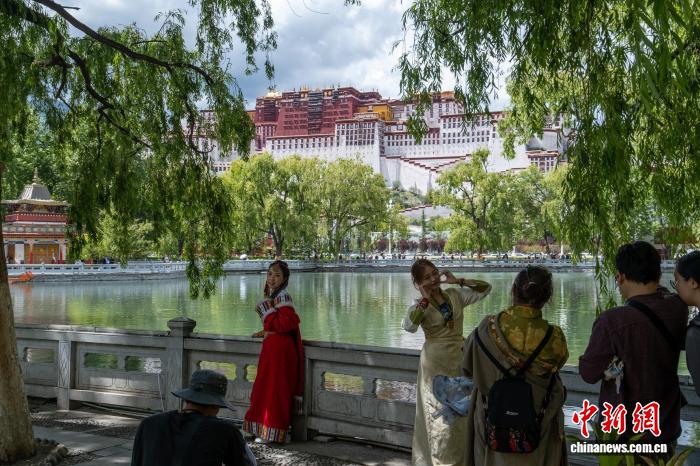 7月29日,游客在布達(dá)拉宮廣場東側(cè)人工湖附近“打卡”。中新社記者 江飛波 攝