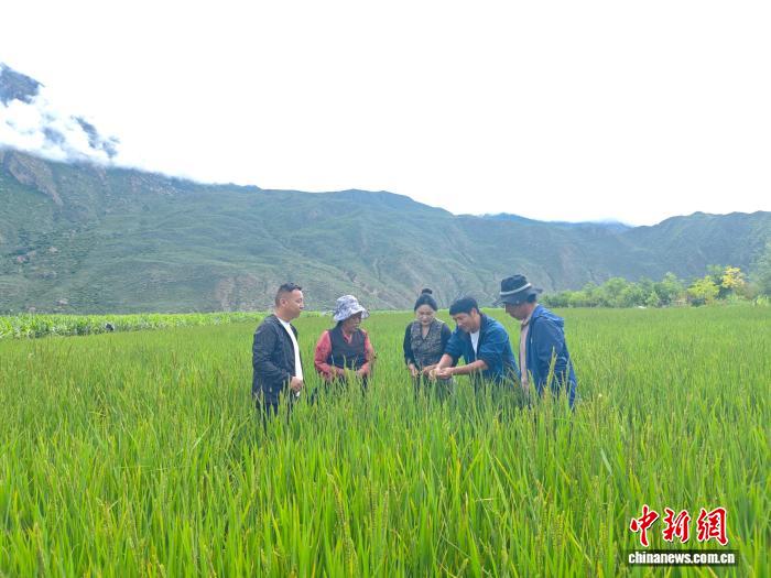 8月11日,范春捆在西藏山南加查縣冷達鄉(xiāng)共康村水稻田里觀察水稻孕穗情況。中新社發(fā) 陳立超 攝