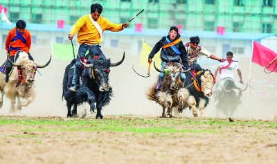 西藏拉薩市達(dá)孜區(qū),農(nóng)牧民群眾在參加賽牦牛比賽。新華社發(fā)