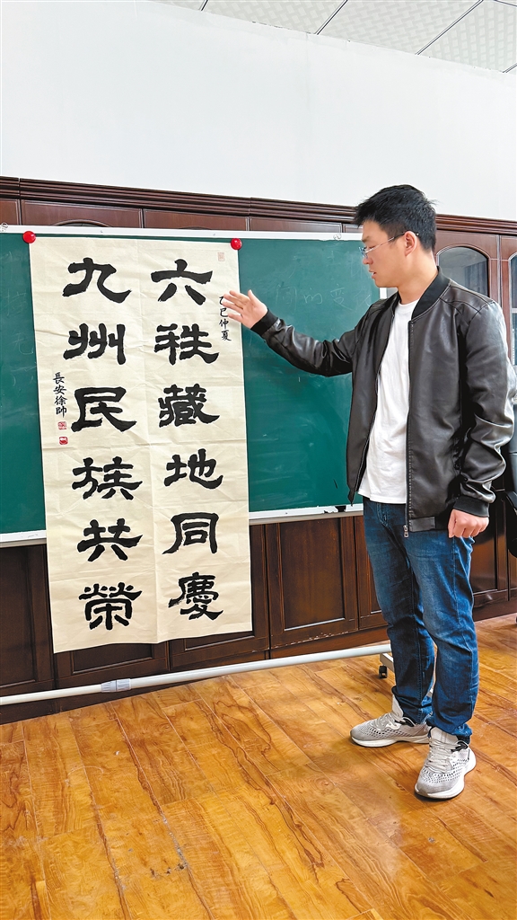 作為西藏自治區(qū)青年聯(lián)合會委員、西藏自治區(qū)青年書法家協(xié)會理事,徐帥的作品多次獲獎,但他更珍視的是傳承的意義。他在校園開設(shè)書法篆刻工作室,教藏族同學(xué)刻自己的名字印章,也向當(dāng)?shù)厮嚾苏埥滩匚淖碳记?。如今,這位即將畢業(yè)的碩士研究生,最大的愿望是舉辦一場個人篆刻藝術(shù)展。