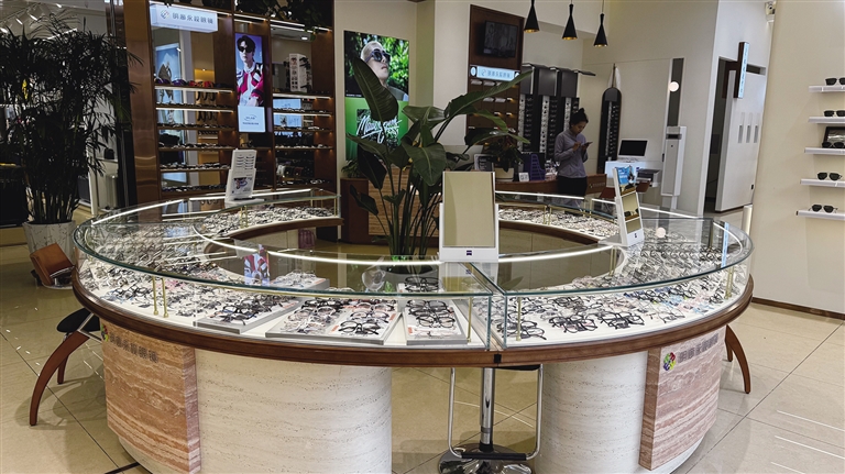 在南樓一層,瑞幸咖啡的藍(lán)色招牌與霸王茶姬的紅色燈籠相映成趣,構(gòu)筑起高原最強(qiáng)的咖啡茶飲矩陣。澳免國際美妝區(qū)內(nèi),蘭蔻、雅詩蘭黛等全球品牌專柜整齊陳列,產(chǎn)品與區(qū)外同步上新且價(jià)格一致。明廊永視眼鏡店的乳白色柜臺(tái)前,驗(yàn)光設(shè)備閃爍著科技微光,負(fù)責(zé)人彭春永介紹:“升級(jí)后加裝了藏式紋樣屏風(fēng),自動(dòng)門和LED屏讓老店煥發(fā)新顏。”