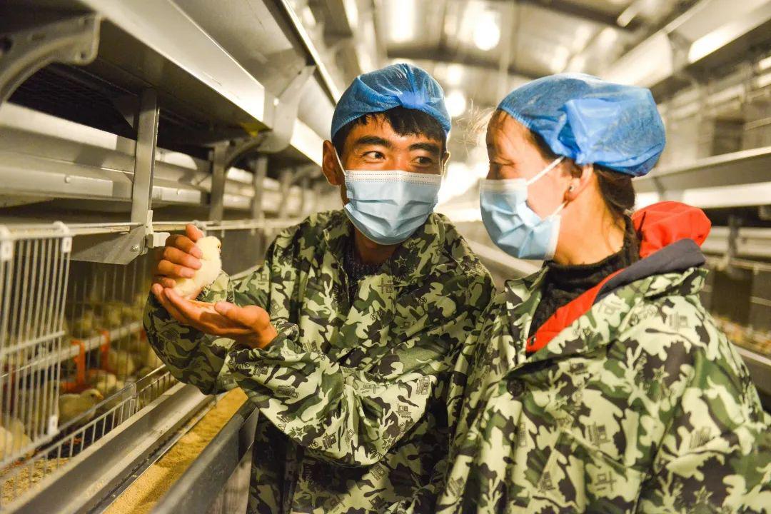 產(chǎn)業(yè)園內(nèi)的養(yǎng)殖員正在檢查雞苗。 (新華社發(fā))