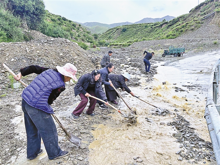 圖為駐村工作隊隊員與群眾一起疏通道路。