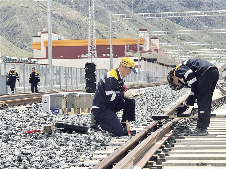 7月29日14時(shí)30分,拉林鐵路山南站,馬琳一手持道尺、一手握打號(hào)筆,一步一彎腰仔細(xì)檢查線路,額頭上沁滿的汗珠在高原陽光下熠熠生輝。這位已在青藏鐵路線上扎根29年的老線路工,用指腹反復(fù)摩挲著滾燙的鋼軌邊緣——這是他與鐵路對(duì)話的特殊方式。