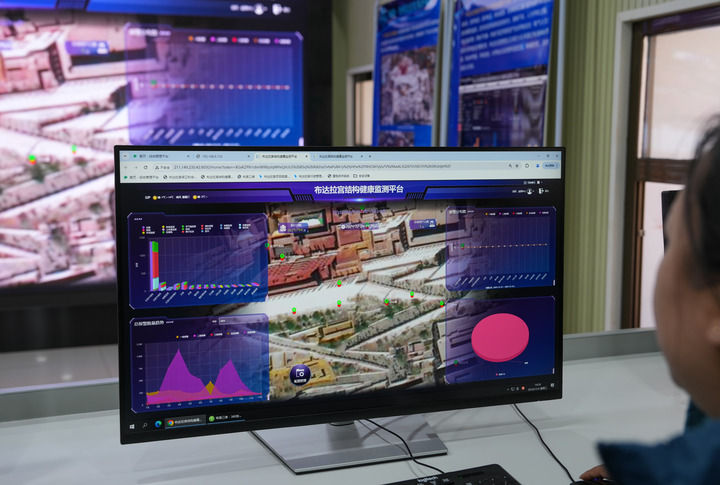 在布達拉宮監(jiān)測中心,工作人員正忙著通過數(shù)字化平臺,實時監(jiān)控布達拉宮的“一磚一瓦”。
