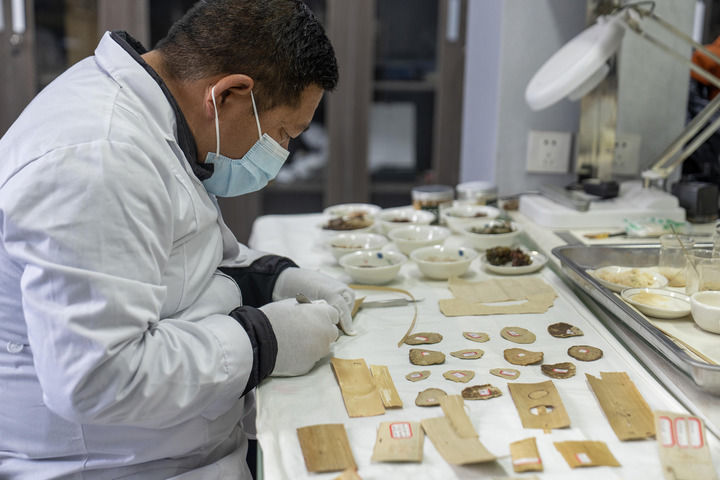 布達拉宮貝葉經(jīng)實驗性修復(fù)小組實驗室工作人員對貝葉進行處理(2025年5月25日攝)。新華社記者 旦增尼瑪曲珠 攝