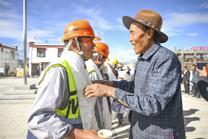 機(jī)器的轟鳴聲與悠揚(yáng)的藏民族歌曲交織在一起,村民們依次向援建者獻(xiàn)上潔白的哈達(dá)、斟滿飄香的酥油茶,還有村民用大拇指蘸著白色的糌粑在他們身上點(diǎn)個(gè)指印,宛如一個(gè)個(gè)真誠(chéng)的“點(diǎn)贊”,場(chǎng)景溫暖感人。