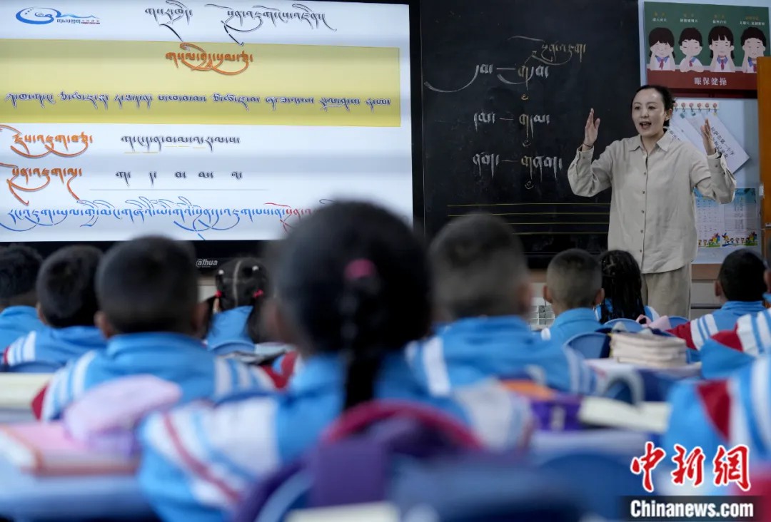 2025年3月10日,拉薩市第一小學藏語文老師桑旦旺姆使用科技設備在課堂上講授藏語。中新社記者 李林 攝