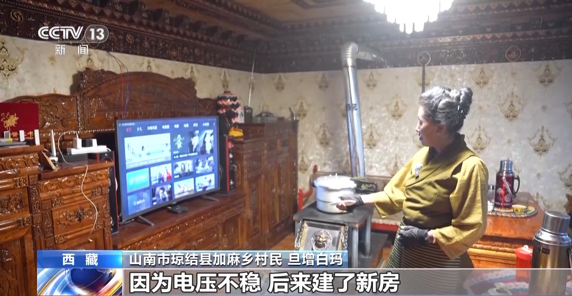 山南市瓊結(jié)縣加麻鄉(xiāng)村民 旦增白瑪:這個是2023年新建的,這邊是以前住的地方,只有一個燈泡,其他家電也不敢用,因為電壓不穩(wěn)。后來建了新房,現(xiàn)在電壓穩(wěn)了,可以放心看電視,而且還買了很多新家電,冰箱、洗衣機、電視。