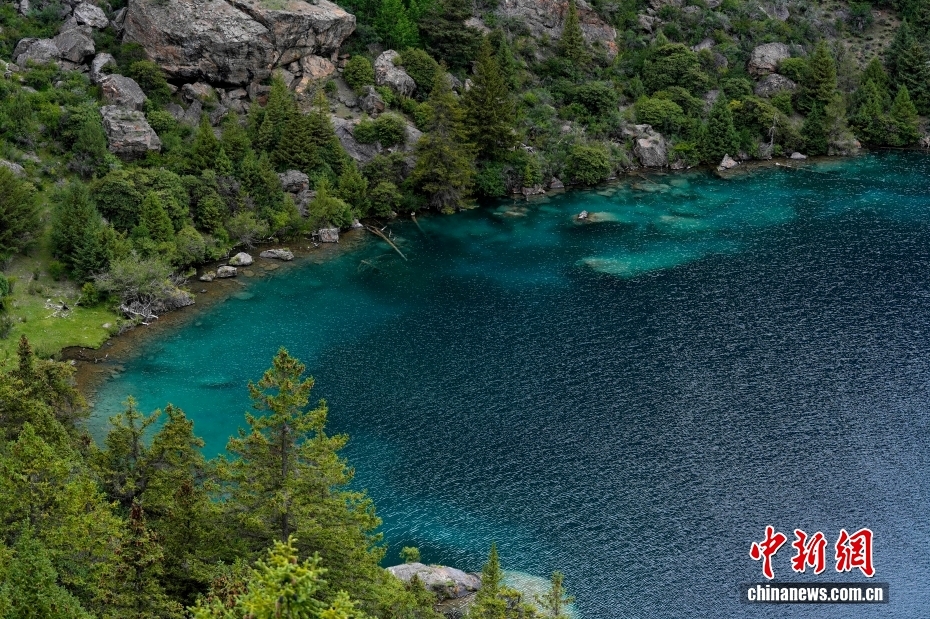 俯瞰西藏昌都三色湖風光。三色湖位于西藏昌都邊壩縣普玉村境內(nèi)。夏日,三色湖周邊郁郁蔥蔥,景色秀麗。中新社記者 李林 攝