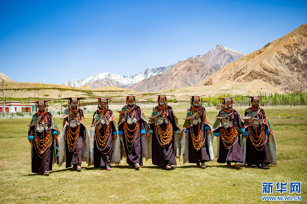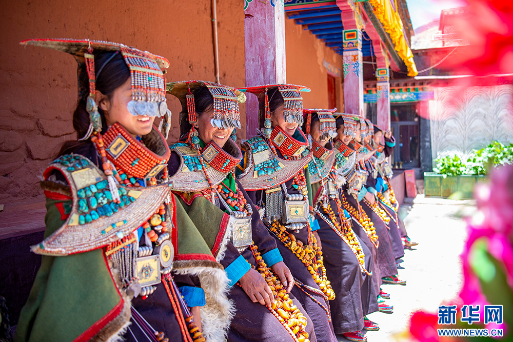 身著“普蘭服飾”的普蘭縣科迦村村民(6月10日攝)?!捌仗m服飾”,主要由袍子、披風、頭飾、項鏈、腰帶、耳墜、靴子組成。其中最精美、最獨特的為婦女服飾,外形設計如同孔雀開屏,被譽為“孔雀”服飾,一套重達20多公斤,裝飾有黃金、白銀、蜜蠟、珊瑚、綠松石等。新華網 旦增努布 攝