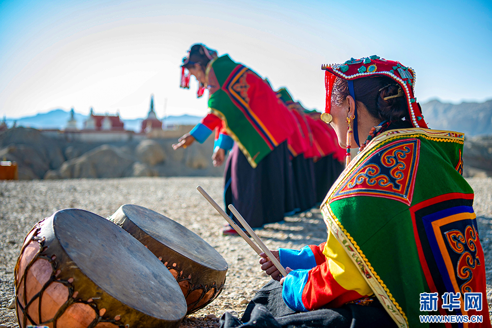 自治區(qū)級“宣舞”非遺傳承人央金(右)在古格王國遺址腳下伴奏鼓樂(6月12日攝)。新華網 旦增努布 攝