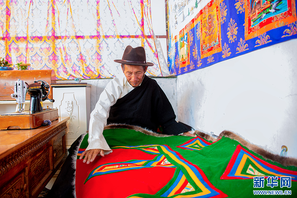 “噶爾傳統(tǒng)服飾”地區(qū)級代表性傳承人石達次仁在介紹自治區(qū)級非物質文化遺產“噶爾傳統(tǒng)服飾”(6月14日攝)?!案翣杺鹘y(tǒng)服飾”由羊羔皮和呢子內外兩面縫制而成,形狀為正方形,制作簡易,內里均為純白色的羊羔皮,羊羔皮既保暖又有裝飾性。新華網 旦增努布 攝
