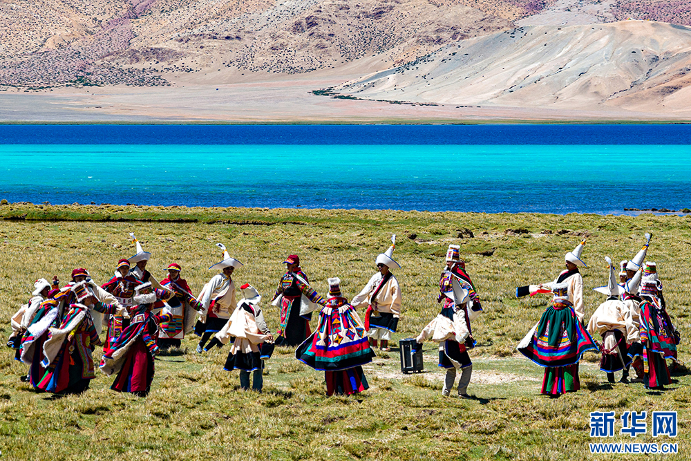 身穿自治區(qū)級非物質文化遺產“森郭服飾”的改則縣群眾在湖畔跳鍋莊(6月21日攝)?!吧棥北蛔u為“五彩彩虹服”,主要由紅、綠、黑、黃、藍五種顏色的氆氌制成。新華網 旦增努布 攝