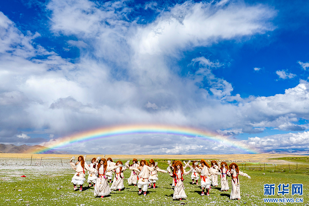 措勤縣藝術團在表演自治區(qū)級非物質文化遺產磁石“帕”卓(6月23日攝)。該舞蹈動作優(yōu)美歡快、充滿動感,帶有彈性舞步。近年來,措勤縣將磁石“帕”卓改編為課間操進校園,讓學生感受當?shù)胤沁z魅力。新華網 旦增努布 攝