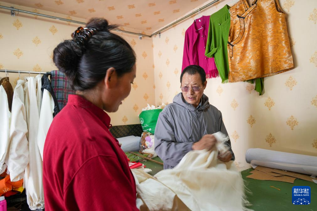 洛桑麥朗(右)在畢業(yè)學(xué)生開設(shè)的店鋪詢問生意情況(8月15日攝)。新華社記者 晉美多吉 攝