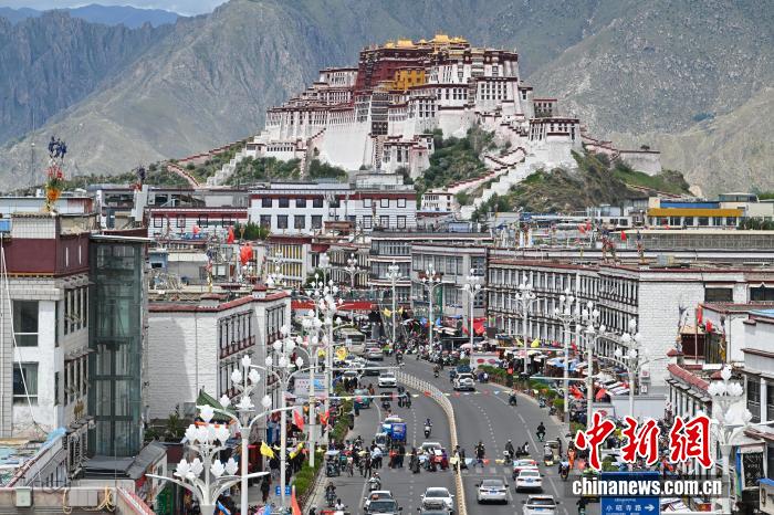 2025年8月18日,隨著西藏自治區(qū)成立60周年大慶臨近,拉薩街頭處處洋溢著喜慶氛圍。圖為市區(qū)主干道上懸掛的彩旗。中新社記者 貢嘎來松 攝