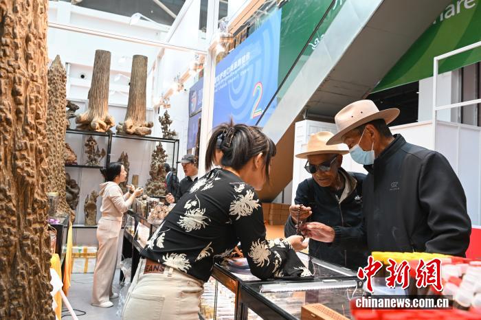 2025年5月16日,2025第二屆拉薩進(jìn)口商品展覽會在西藏會展中心舉行。圖為越南商人(左)向顧客推銷佛珠。中新社記者 貢嘎來松 攝