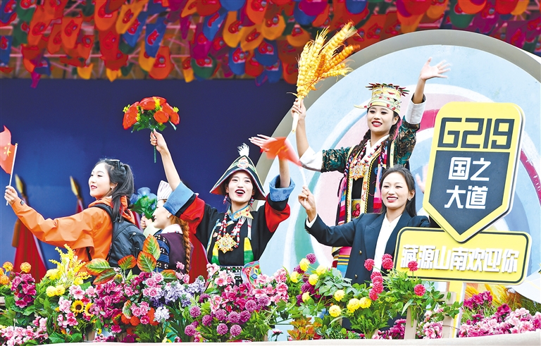 “藏源山南”彩車上的演員通過布達(dá)拉宮廣場時向人群揮手。