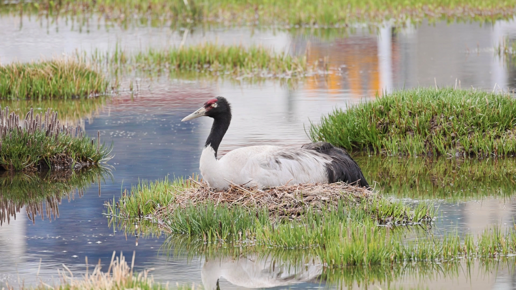 黑頸鶴正在孵蛋,身旁的水面上是申扎縣城的倒影。