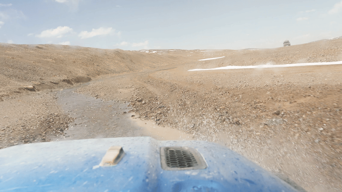 路面逐漸從“蜿蜒崎嶇的溪流”變成“波濤洶涌的大海”,越野車?yán)锖孟褚粋€(gè)迪斯科舞池,每件東西都像被賦予了生命一般蹦蹦跳跳,伴隨著我們這些乘客的驚呼,連同引擎的轟鳴一起,被揉碎在無邊荒原的呼嘯風(fēng)聲中。