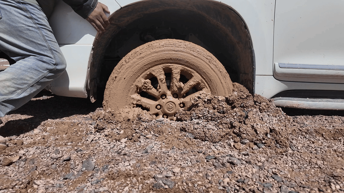 陷在濕軟泥地中的巡護(hù)車車胎。