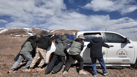 眼前這一幕仿佛預(yù)示著藏羚羊的遷徙之路和我們的巡護(hù)之路同樣艱難。再往前行駛不遠(yuǎn),車隊(duì)中的皮卡車肉眼可見在泥里越陷越深。